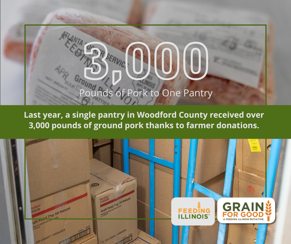 Protein is one of the most requested items at food pantries, and often the hardest to provide. Last year, Eastern Illinois Foodbank received more than 3,000 pounds of ground pork through the Grain for Good initiative. That donation went straight to Open Arms Food Pantry in Woodford County.
